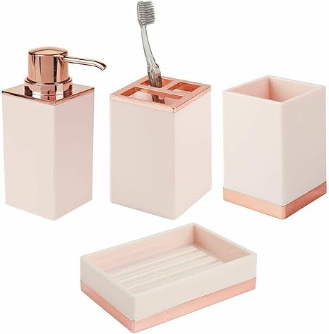 We offer outstanding service and best offer on the market. Resin bathroom accessories sets 5pcs toothbrush dish soap holder pink color. With everything from light pulls to toilet seats, you'll find everything you need here to complete your look. Mdesign square storage apothecary jar for bathroom, 2 pack. Join prime to save $1.50 on this item. Durable and versatile, our bathroom accessories sets will coordinate perfectly with our other items such as our towels, bath mats and more. A glam pink bathroom done with stone and marble, with a refined pink vanity, a vintage chandelier and gold fixtures. We constantly get questions from readers who want help decorating their pink bathroom (pam estimates there were 10 million built, hence the need), so we've set a new, epic goal: A millenial pink bathroom with a floating vanity clad with tiles, stained wood and black grout to make a contrast. 99 get it as soon as wed, may 19 Sold and shipped by mdesign. Rose gold bathroom accessories at homegoods and marshall's. See more ideas about bathroom decor, bathrooms remodel, gold bathroom decor.